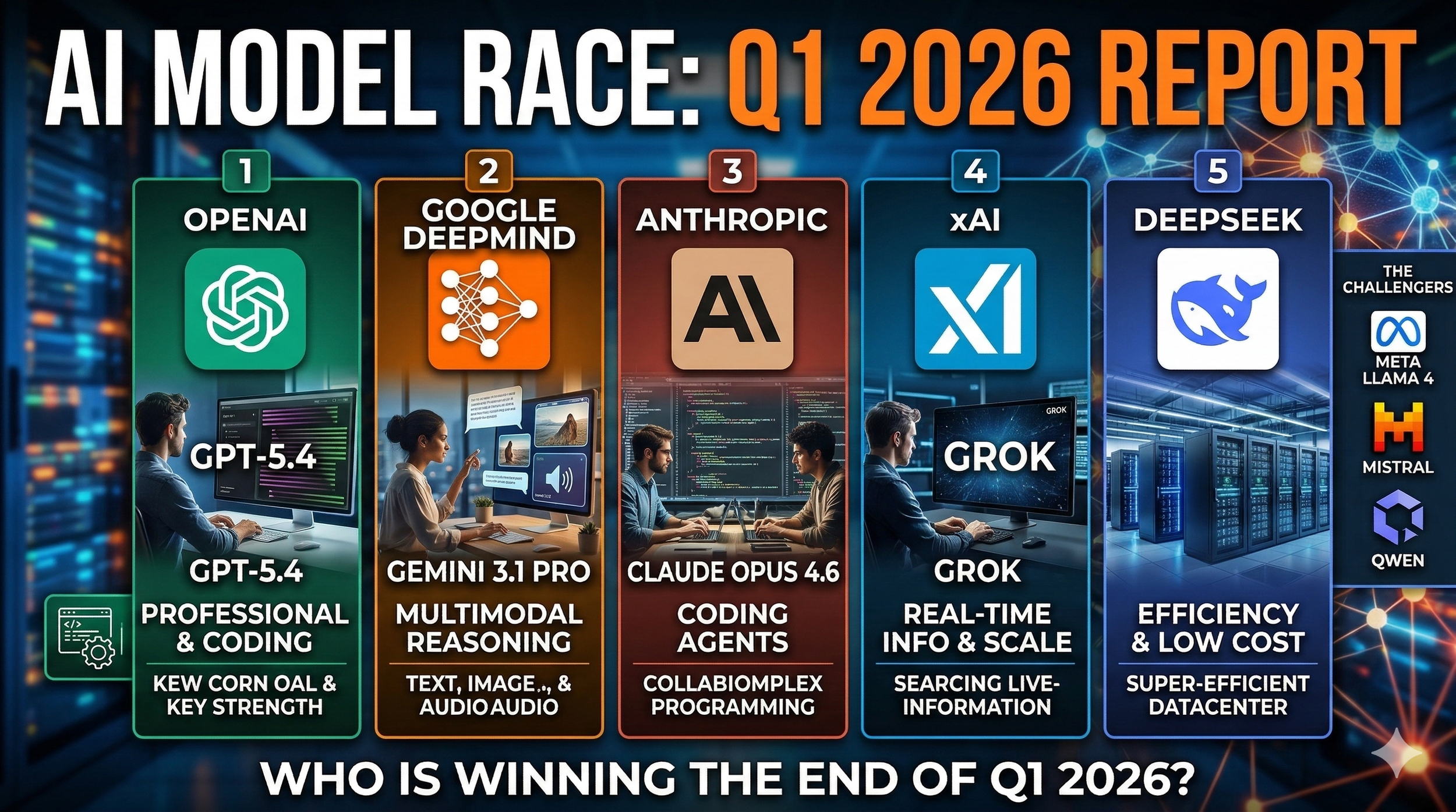 The first thing to say clearly is that the race has tightened, not simplified. OpenAI is still one of the central leaders. Google DeepMind has clearly strengthened its position. Anthropic remains extremely strong at the frontier, especially in coding and long-horizon agentic work. xAI is still in the top group because of product momentum, real-time search integration, and capital intensity. Meanwhile, the Chinese side of the race is no longer something people can dismiss casually: DeepSeek and Alibaba’s Qwen have made the competition much more serious, especially on cost and increasingly on agentic capabilities.
